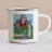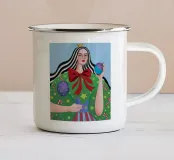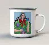 Op dit schilderij staat een figuur met lang zwart-wit gestreept haar, die een groene jurk draagt met versieringen in vakantiethema. De figuur houdt een paars ornament en een kaart vast tegen een blauwe achtergrond.