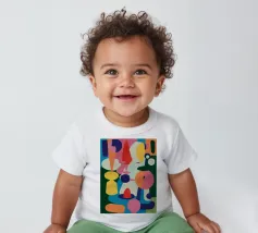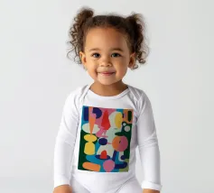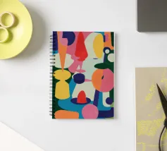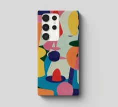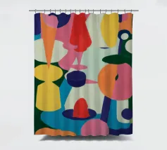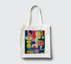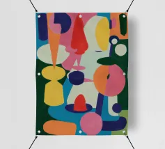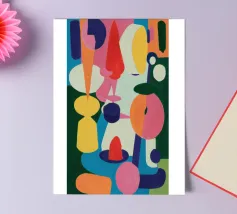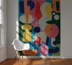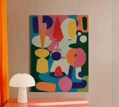 Een harmonieuze compositie van kleurrijke, abstracte en organische vormen past als een puzzel in elkaar en creëert een levendige en evenwichtige symfonie van vorm en kleur in een moderne stijl.