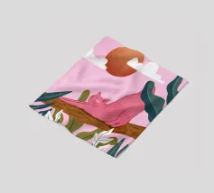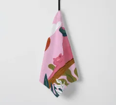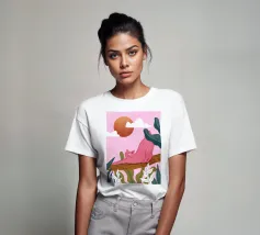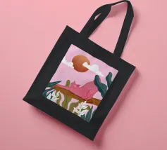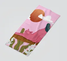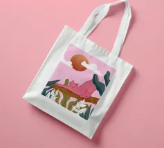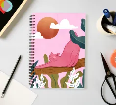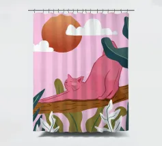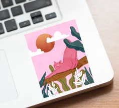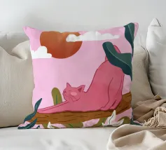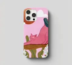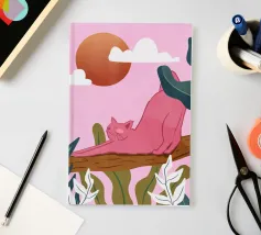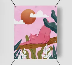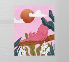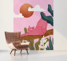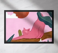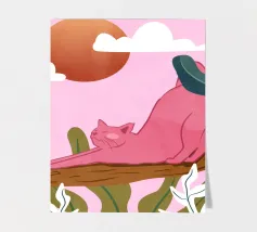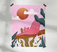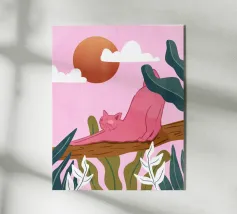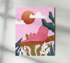 Een chille kat geniet van het gouden uur en strekt zich lui uit op een boomtak. Zachtroze tinten en weelderig groen zorgen voor de perfecte ontspannen sfeer. De ultieme esthetiek voor iedereen die houdt van gezellige, zorgeloze momenten.