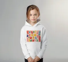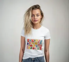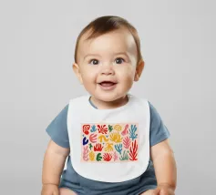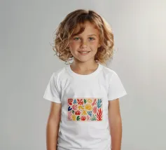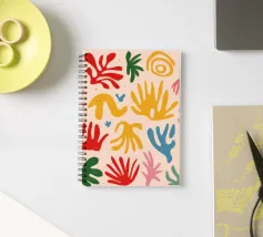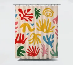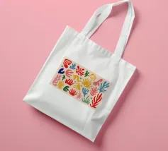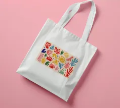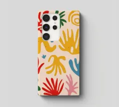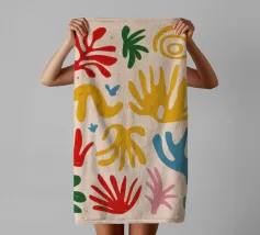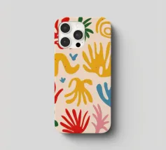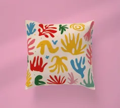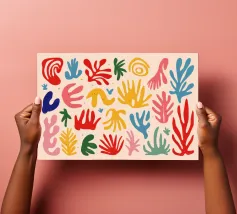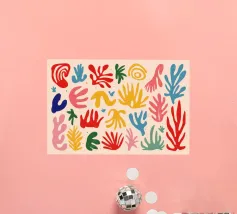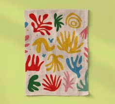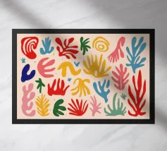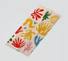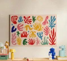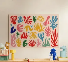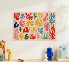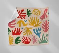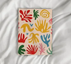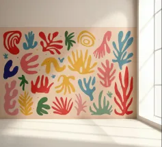 Een levendig en vrolijk abstract patroon van bladeren en organische vormen, sterk geïnspireerd op Maraoui-knipsels. De energieke compositie en felle kleuren creëren een gevoel van dans en feest.