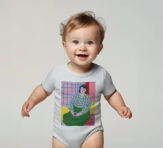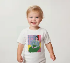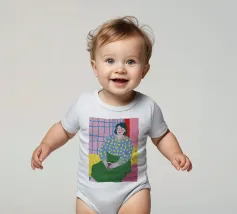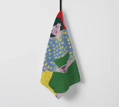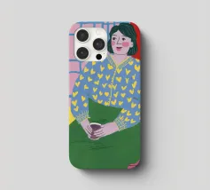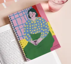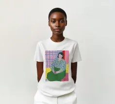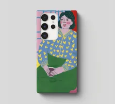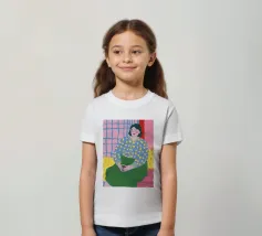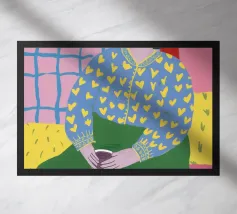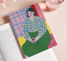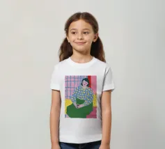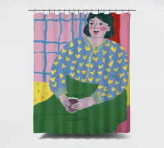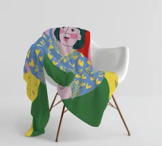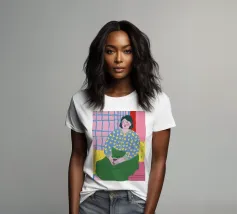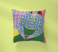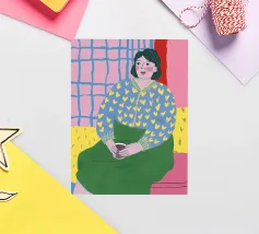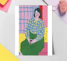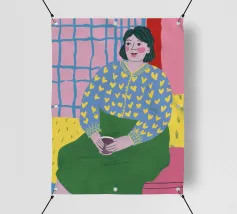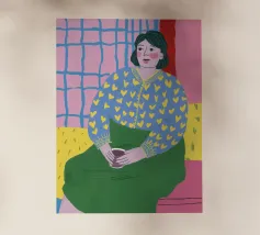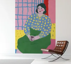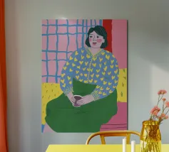 Een vrouw in een blauw shirt met patroon en een groene broek zit nadenkend in een gele stoel tegen een roze achtergrond, haar uitdrukking is peinzend en sereen.