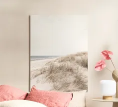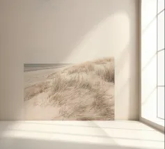 Dit motief van een rustig strandlandschap met zachte duinen en hoog, droog gras straalt pure sereniteit en natuurlijkheid uit. Perfect voor iedereen die op zoek is naar een band met de natuur en die houdt van minimalistisch design. De lichte tinten en open compositie maken van dit kunstwerk een tijdloze blikvanger, ideaal voor producten zoals wandkunst, kussens en mokken. Haal het rustgevende karakter van de kust in huis en laat je inspireren door de tijdloze charme van de natuur. Perfect voor een moderne en eenvoudige inrichting.