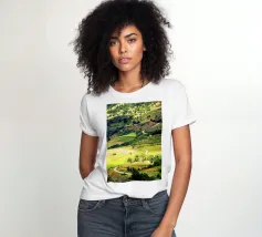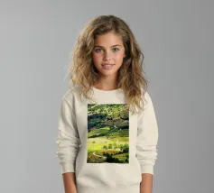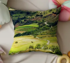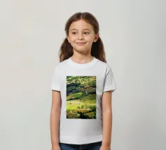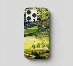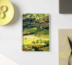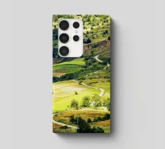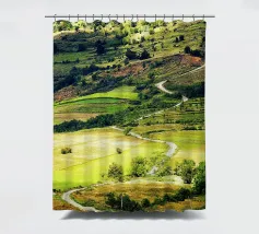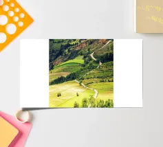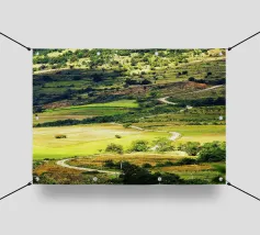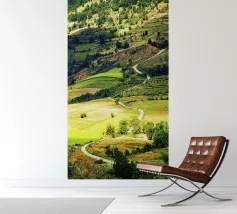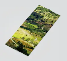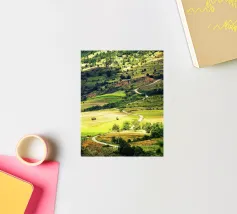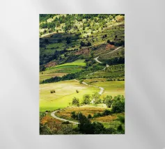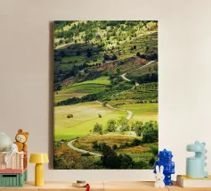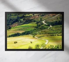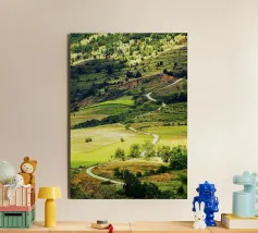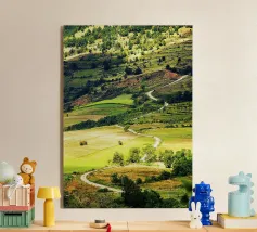 Een heuvel in detail vastgelegd, waarbij de natuurlijke terrassen, verschuivende grasschakeringen en gecultiveerde texturen zichtbaar worden. In het hart van de compositie loopt een kronkelend pad sierlijk omhoog, het oog omhoog trekkend door de gevarieerde vegetatie. Deze verticale fine art print brengt diepte en organisch ritme, waardoor het perfect is voor gangen, studeerkamers, woonkamers, of elke ruimte die een vleugje natuurlijke harmonie en beweging verwelkomt.