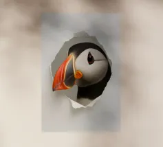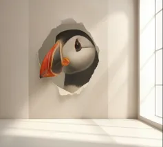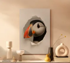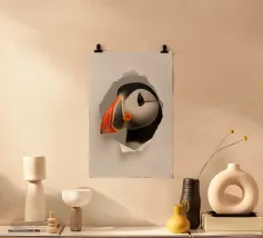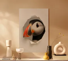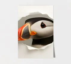 Geef je wanddecoratie persoonlijkheid en charme met deze speelse print van een papegaaiduiker. Met een realistische papegaaiduiker die door gescheurd papier piept, voegt dit creatieve en moderne ontwerp visuele diepte en een leuk 3D illusie-effect toe. De gedetailleerde texturen, heldere snavelkleuren en zachte neutrale tinten maken het perfect voor woonkamers, kinderkamers, kantoren of ruimtes die geïnspireerd zijn op de kust en de natuur. Een uniek cadeau voor papegaaiduikerliefhebbers, vogelliefhebbers, natuurliefhebbers of iedereen die houdt van eigenzinnige, opbeurende kunst die een glimlach en een gesprek opwekt.