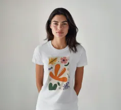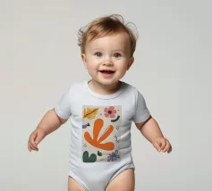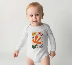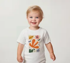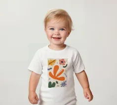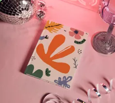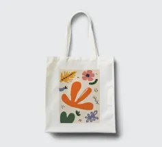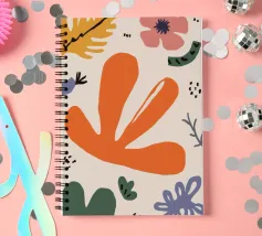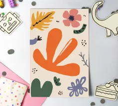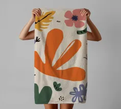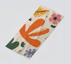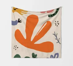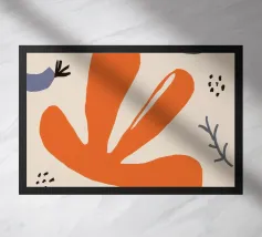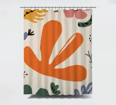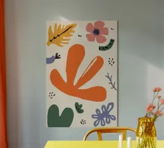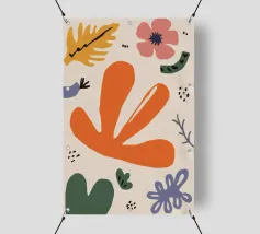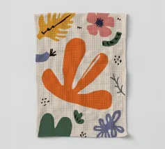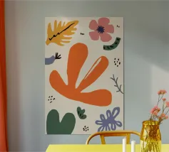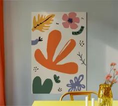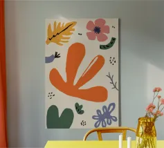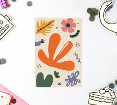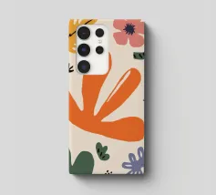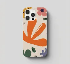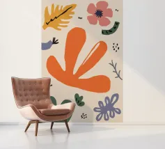 Een grillige verzameling abstracte bloemen en bladeren in oranje, roze en groen is speels verspreid over een neutrale achtergrond, waardoor een vrolijke, moderne tuin ontstaat.