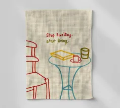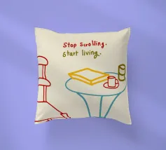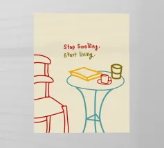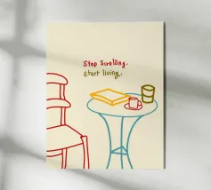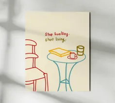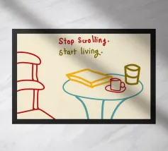 Neem even afstand van het scherm en geniet van de kleine geneugten, zoals een warme kop koffie, een goed boek en stille momenten. Deze print herinnert je eraan om aanwezig te zijn en rustig adem te halen. Het is een zacht duwtje in de rug om te gaan leven en niet alleen maar te scrollen.