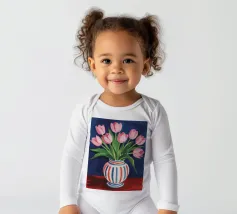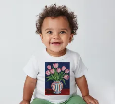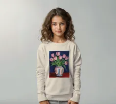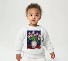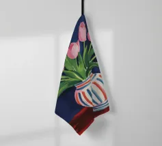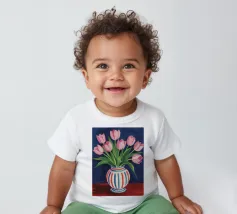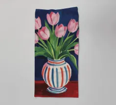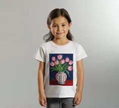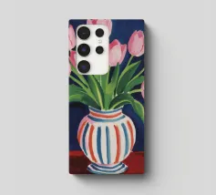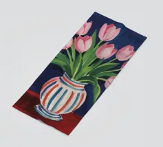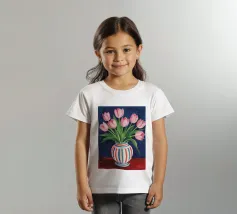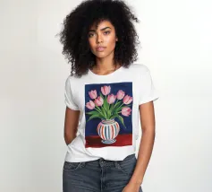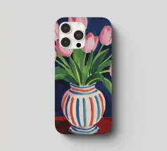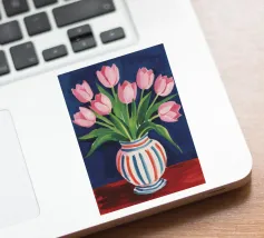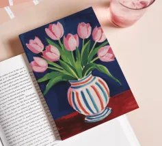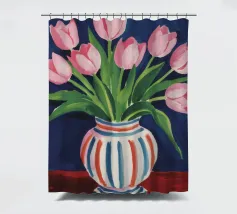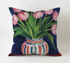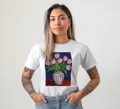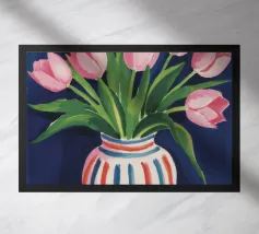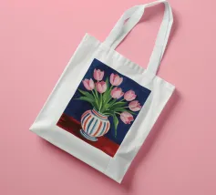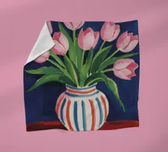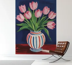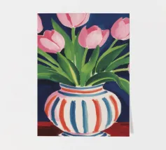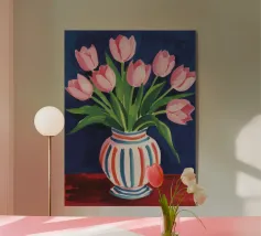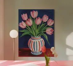 Een prachtig boeket roze tulpen in een klassieke, blauw-wit gestreepte vaas. De compositie is tijdloos, fris en vol vrolijke, lenteachtige charme.