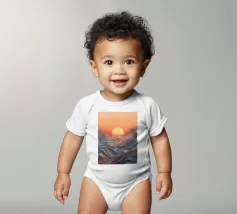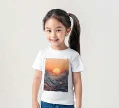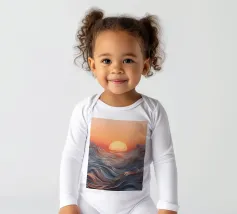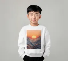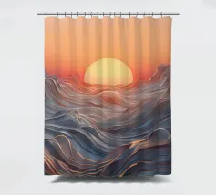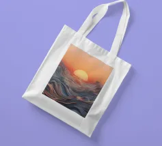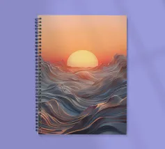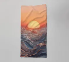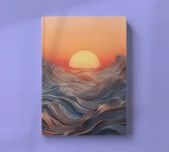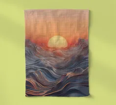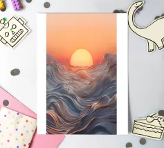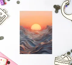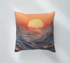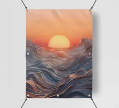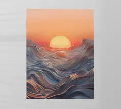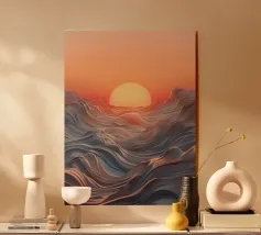 Een betoverend abstract zeegezicht met een zonsondergang boven golvende, vloeiende golven. De levendige oranje tinten vermengen zich naadloos met koele blauwtinten en creëren een adembenemende en serene sfeer.