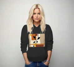 Abstracte lijnen en blokken van gedempte kleuren creëren een moderne compositie met een minimalistische esthetiek. Een gestileerde plantvorm en een eenvoudige vaasvorm voegen organische elementen toe, afgezet tegen geometrische vormen.