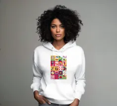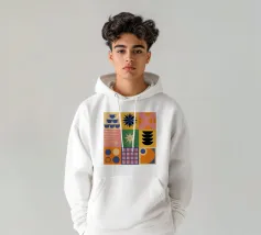 Een gedurfde en energieke abstracte compositie met een raster van kleurrijke geometrische patronen. De levendige mix van vormen, van zonnen tot damborden, creëert een vrolijk en dynamisch visueel feest.