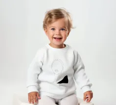 Onze baby sweatshirts bestaan uit 85% biologisch katoen en 15% gerecycled polyester.