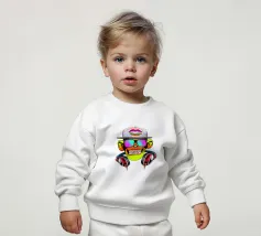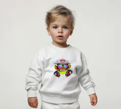 Onze baby sweatshirts bestaan uit 85% biologisch katoen en 15% gerecycled polyester.