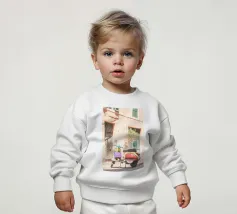 Onze baby sweatshirts bestaan uit 85% biologisch katoen en 15% gerecycled polyester.