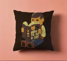 Een persoon leest een boek met de titel "How to be a cat", een kunst voor alle kattenliefhebbers.