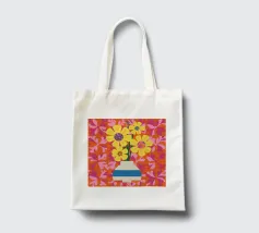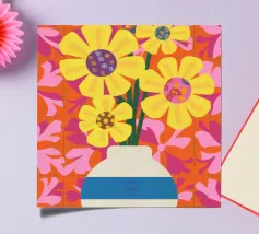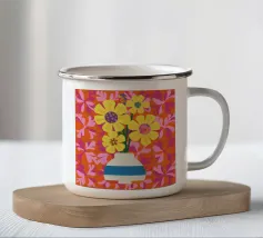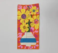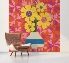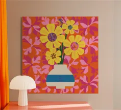 Een gestreepte witte en blauwe vaas bevat gele en roze bloemen tegen een levendige, quiltachtige achtergrond van roze, oranje en rode bloemmotieven.
