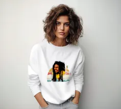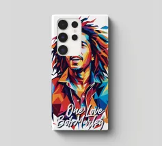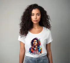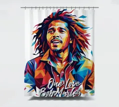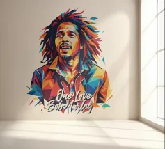 Dit WPAP-portret van Bob Marley legt zijn iconische look vast met behulp van krachtige hoeken en heldere kleuren. Zijn ontspannen uitdrukking en kenmerkende dreadlocks worden weergegeven met scherpe contrasten, wat zorgt voor een gevoel van beweging en leven. De achtergrond is gebaseerd op abstracte reggae-geïnspireerde patronen, waardoor het ontwerp levendig en fris is. Het combineert de legendarische status van Marley perfect met een eigentijdse kunststijl.