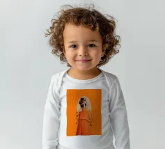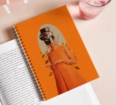 er is een foto in mijn hoofd die elke herinnering aan jou bevat. ~ een vrouw die een oranje jurk draagt met een vintage camera als hoofd levendige oranje achtergrond met retro bloemenelementen.