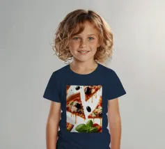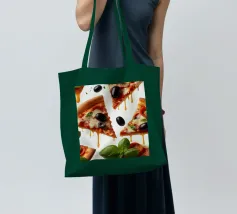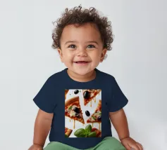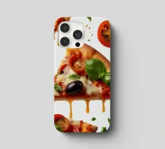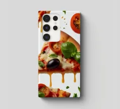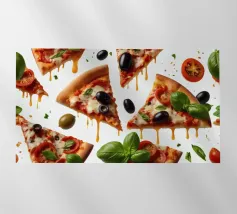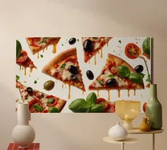Verschillende stukken pizza zijn kunstig uitgestald met levendige toppings zoals olijven, tomaten en verse basilicumblaadjes, wat een uitnodigend culinair beeld oplevert.