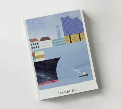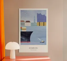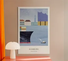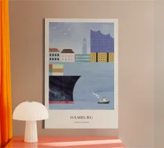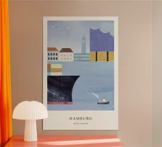 "Architectuurtekening ontmoet reisposter in art-decostijl."