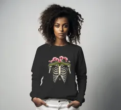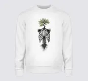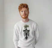 In het midden en symmetrisch ondersteunt een menselijke ribbenkast een bloeiende boom. Zijn bladerrijke takken strekken zich naar boven uit, terwijl zijn wortels door de ruggengraat cascaderen en merg vervangen door geheugen. Geen aarde, geen lucht - alleen botten, leven en zwaartekracht in balans. Een portret van eeuwige terugkeer.