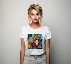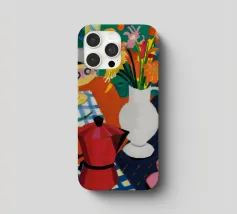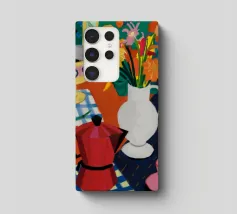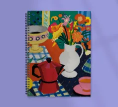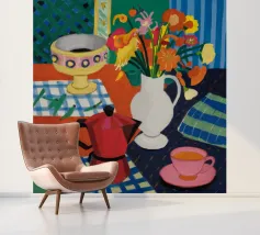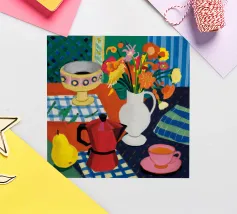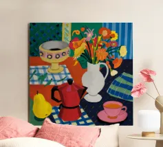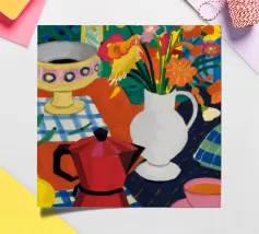 Een speels en druk stilleven van een koffiepauze, met een rode mokapot, een witte kan en een kop koffie. De scène is gevuld met bloemen en gedekt op een geruit tafelkleed, waardoor een vrolijk, licht chaotisch en kleurrijk moment ontstaat.