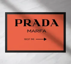 Een minimalistisch typografisch kunstwerk geïnspireerd op de iconische Prada Marfa installatie.