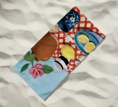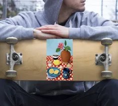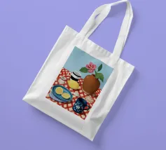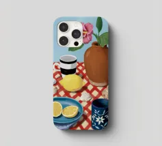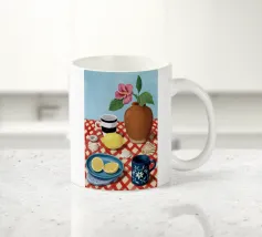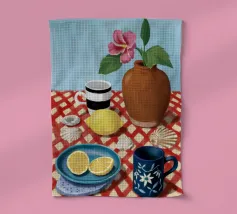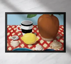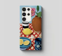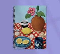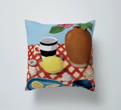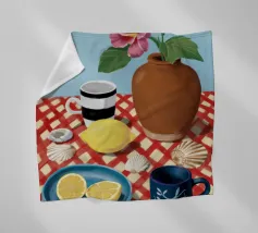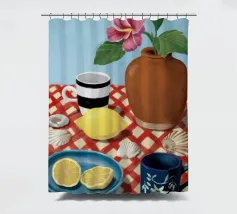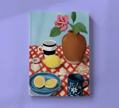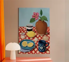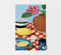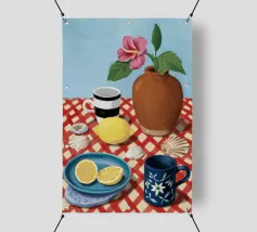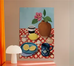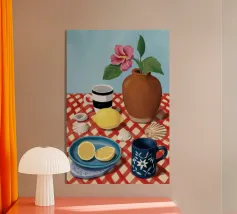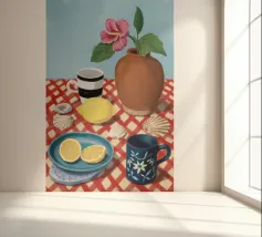 Een elegant stilleven van een enkele roze roos in een bruine vaas, citroenen in een blauwe kom en een glas water, alles gerangschikt op een rood en wit geruit tafelkleed.