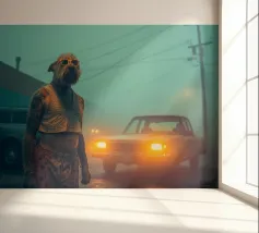 Voor zijn oude Volvo, onder de nachtelijke hemel, loopt Rudy langzaam, zijn ogen gericht op het gebarsten asfalt. Het was een zware dag, de zon brandde en het fysieke werk was uitputtend. Hij heeft zich nauwelijks aangekleed voordat hij naar buiten ging, zijn gescheurde en versleten T-shirt getuigt van zijn vermoeidheid. De nachtbries brengt wat verlichting, maar zijn hoofd is nog steeds zwaar van de zorgen van de dag. Hij steekt een sigaret op en inhaleert diep, op zoek naar een moment van rust in deze godvergeten uithoek van Amerika.
