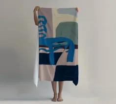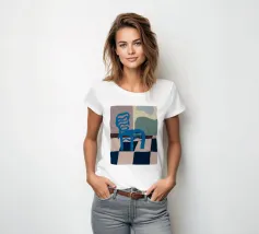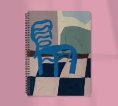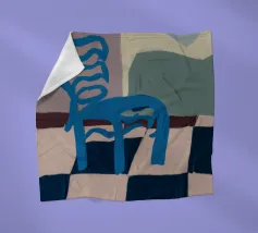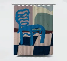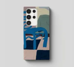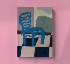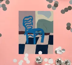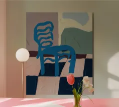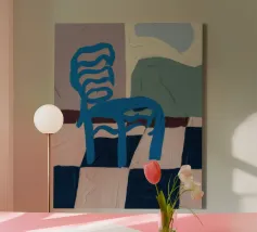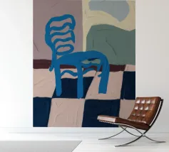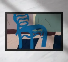 Een eenvoudige maar opvallende illustratie van een enkele blauwe houten stoel tegen een muur, rustend op een gedurfde blauw-wit geblokte vloer. De compositie is minimalistisch, grafisch en heeft een sterk gevoel van plaats en stijl.