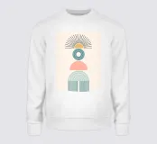 Een geometrische compositie met verschillende vormen, waaronder een halve cirkel die op de zon lijkt, concentrische cirkels en bogen in gedempte pasteltinten. Het ontwerp is symmetrisch en brengt visueel aantrekkelijke elementen in evenwicht.