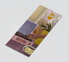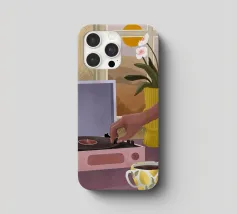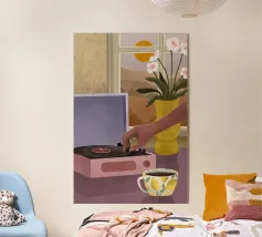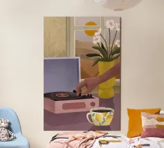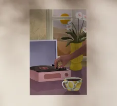 Deze gezellige illustratie in een stilistische stijl met warme kleuren, toont een mensenhand die een plaat afspeelt op een oude platenspeler. Een koffiekop met koffie, een vaas met bloemen voor een raam met een mooi landschap maken de afbeelding compleet.