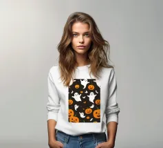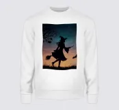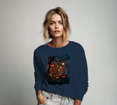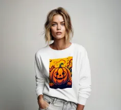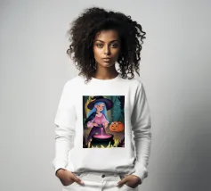 Als de schemering intreedt, zie je een silhouet van een heks op haar bezemsteel tussen de vleermuizen vliegen, met een gloeiende pompoen op de voorgrond, wat een betoverende sfeer creëert.