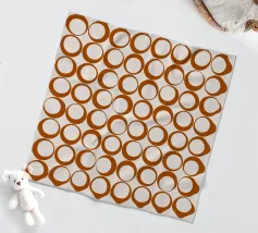 Een repeterend geometrisch patroon met afwisselend rijen van halve cirkels en cirkels in de kleuren blauw en roest tegen een lichte achtergrond. Het ontwerp creëert een gevoel van ritme en beweging door de symmetrische opstelling.