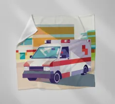 Maak een illustratie van een klassieke auto die over het platteland rijdt in een unieke geometrische stijl.