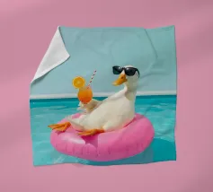 The picture captures a playful and surreal scene at a pool party. A woman swims in clear blue water wearing a shiny disco ball helmet that reflects the sunlight. She lies in a pink inflatable ring and holds a glass with a pink-coloured drink in her hand, adding to the festive atmosphere. Her swimming costume is glittery and matches the glamorous and fun mood of the scene. The water around her glistens and light patterns dance on its surface, adding to the lively and carefree mood of the image.