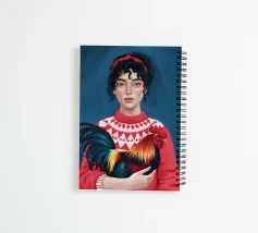This artwork shows a person in a red sweater holding a rooster. The background is dark, highlighting the rustic and charming elements of the scene.