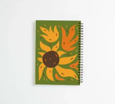Felgele en oranje abstracte vormen die lijken op een zonnebloem. Gebogen vormen en kleine lijnen voegen een dynamisch gevoel van beweging toe aan de compositie.