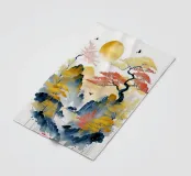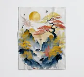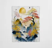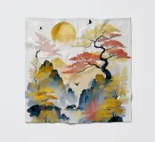 Gouden zon, gelaagde bergen en levendige bomen in herfsttinten.