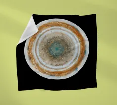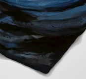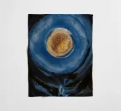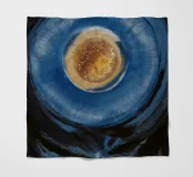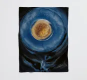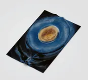 Een gouden bol komt tevoorschijn uit wervelend diepblauw, als een kosmisch scheppingszaadje. Krachtig en mysterieus.