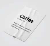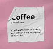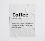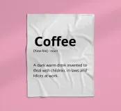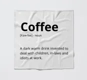 Een humoristische definitie van koffie beschrijft het als een noodzakelijk middel om met alledaagse uitdagingen zoals kinderen, schoonfamilie en collega's om te gaan. De tekst bootst op speelse wijze een woordenboekvermelding na met fonetische spelling en deel van de spraak.