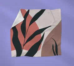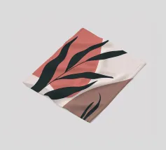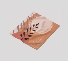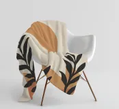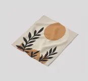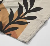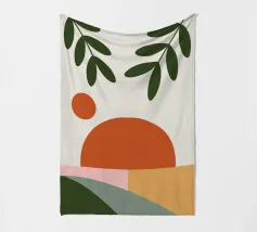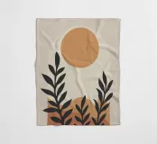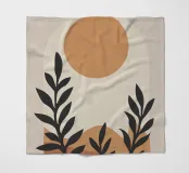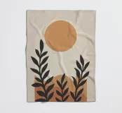 Een minimalistisch ontwerp met zwarte plantensilhouetten tegen een achtergrond van aardse heuvels en een grote, gedempte zon. Het gladde, boogvormige frame voegt een vleugje elegantie toe.