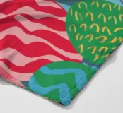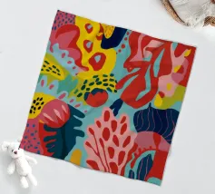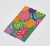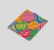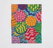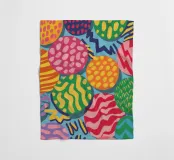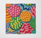 Een levendig en speels patroon is samengesteld uit kleurrijke, overlappende bollen, elk gevuld met unieke texturen en patronen, waardoor een visueel stimulerend en vrolijk abstract stuk ontstaat.