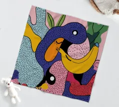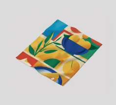 A bold and dynamic patchwork of geometric shapes, featuring stylized bananas and tropical leaves. The vibrant color palette and strong graphic style create a playful and energetic composition.