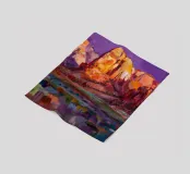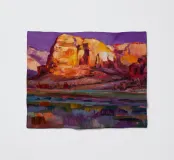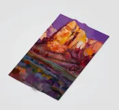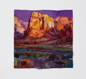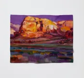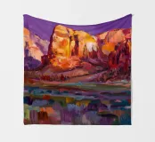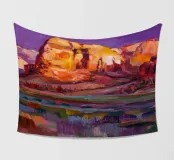 Diep violette en paarse schaduwen vullen een dramatische canyon van rode rotsen. De felle, contrasterende kleuren vangen het intense licht en de stemming van het woestijnlandschap in een moderne, expressieve stijl.