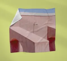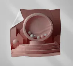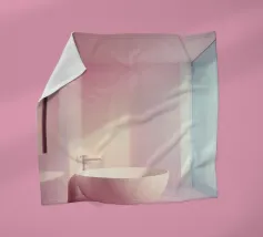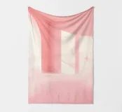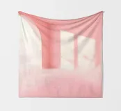 Een serene ruimte versierd met zachtroze muren en grote ramen die zacht zonlicht binnenlaten en delicate schaduwen op de vloer creëren. Een pluizige textuur versterkt de rustige sfeer.