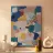 Een abstract patchwork van geschilderde, gestructureerde vormen in een gedempt palet van blauw, oker en beige creëert een verfijnde en prachtig uitgebalanceerde compositie met een artistieke, handgemaakte uitstraling.