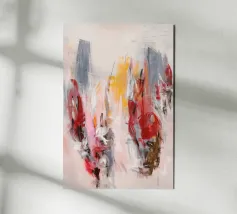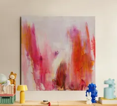 A bold exploration of structure through vivid abstraction. Dominated by layers of crimson, orange, and coral, this dynamic composition interlocks geometric forms with expressive brushwork, creating a rhythmic energy that feels architectural yet emotive. The interplay of sharp angles and soft gradients evokes movement, heat, and vitality — a striking centerpiece for any modern space.