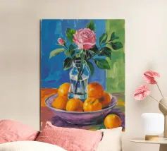 Een uitnodigend stilleven op een helderrode tafel, met een schaal citroenen en een blauwe vaas met delicate witte bloemen. De warme gele achtergrond versterkt de gezellige en levendige sfeer.