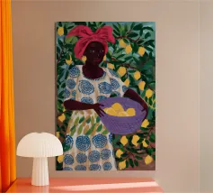 Dit kunstwerk toont een persoon die op een gestreepte stoel zit, omringd door zonnebloemen en een groene tas. De achtergrond is gedempt bruin en creëert een rustieke en reflecterende sfeer.