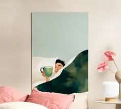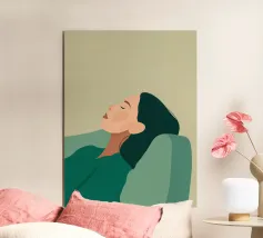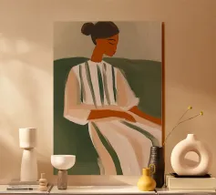 This contemporary portrait captures a moment of quiet introspection through soft painterly textures and a restrained color palette. The feminine figure, rendered in gentle brushstrokes and subtle contrasts, emerges from layered green tones that evoke calm and emotional depth. Vertical marks and delicate highlights add rhythm and atmosphere, while the relaxed pose suggests vulnerability and self-awareness. Balancing figurative clarity with expressive abstraction, this artwork is ideal for modern interiors, editorial illustration, or fine art prints that celebrate stillness, femininity, and refl